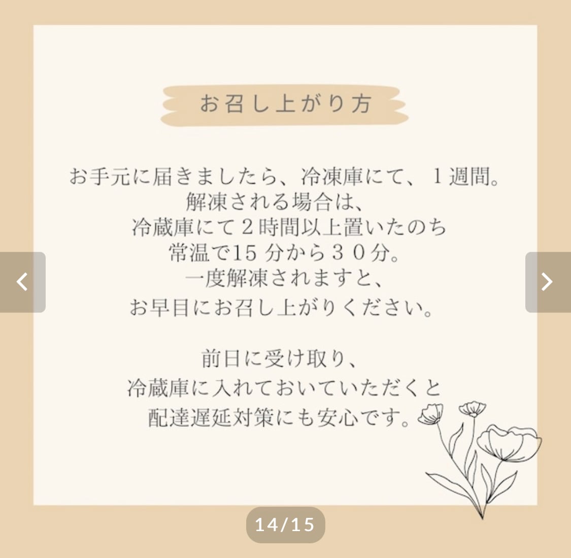 解凍はは冷蔵庫にて2~3時間、常温で15分~30分程おき、