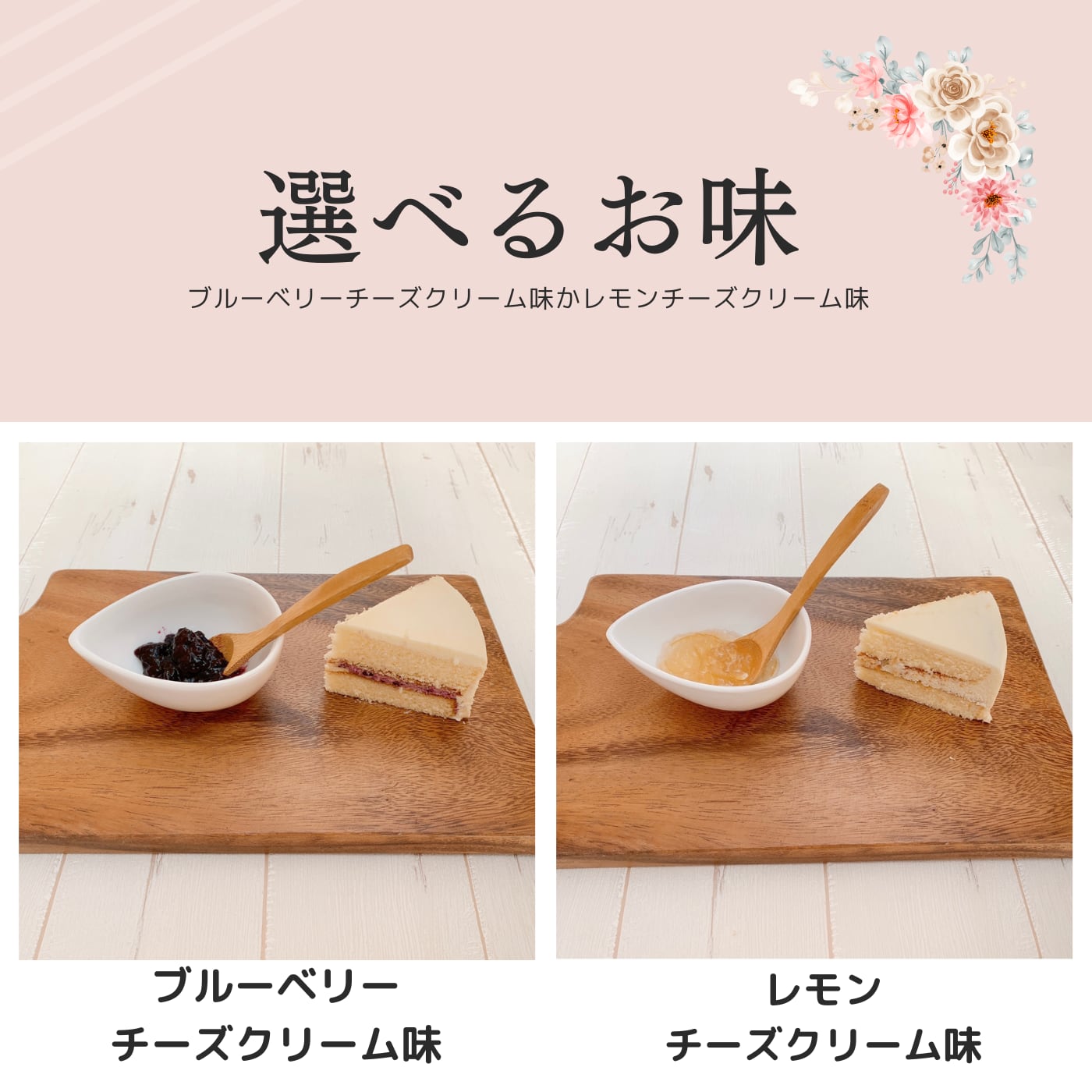 チーズクリームでスポンジを包み、ブルベリー味またはレモン味のチーズクリームを挟んで、レアチーズケーキのような味わいになっています。